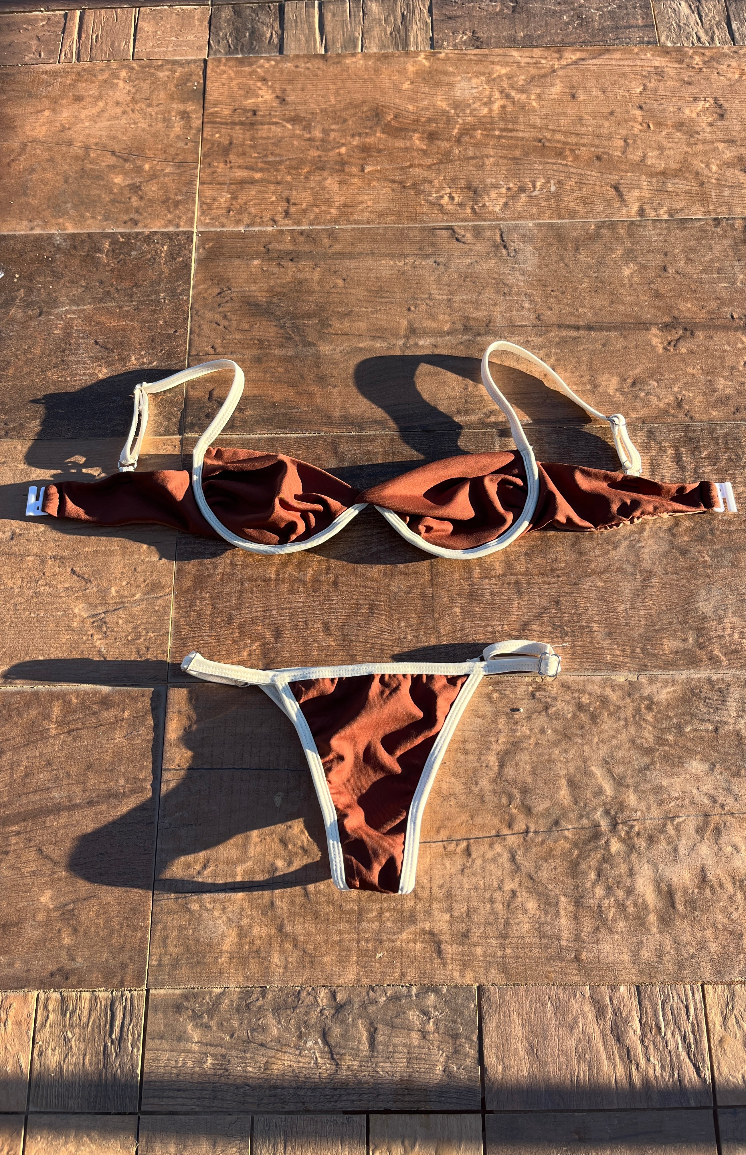 Peça confeccionada em meia taça com reguladores em cima e amarração de lacinho na parte de baixo.
