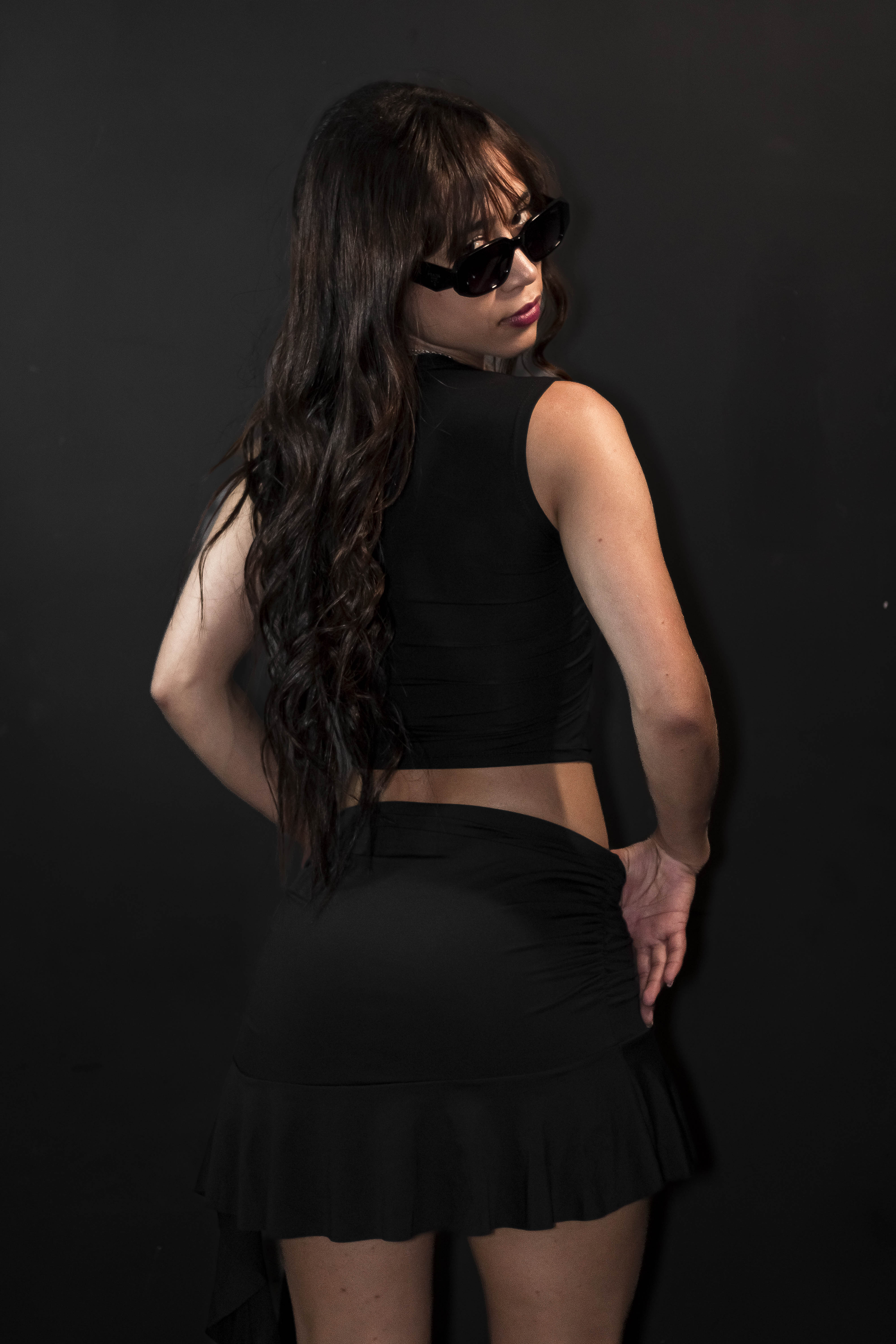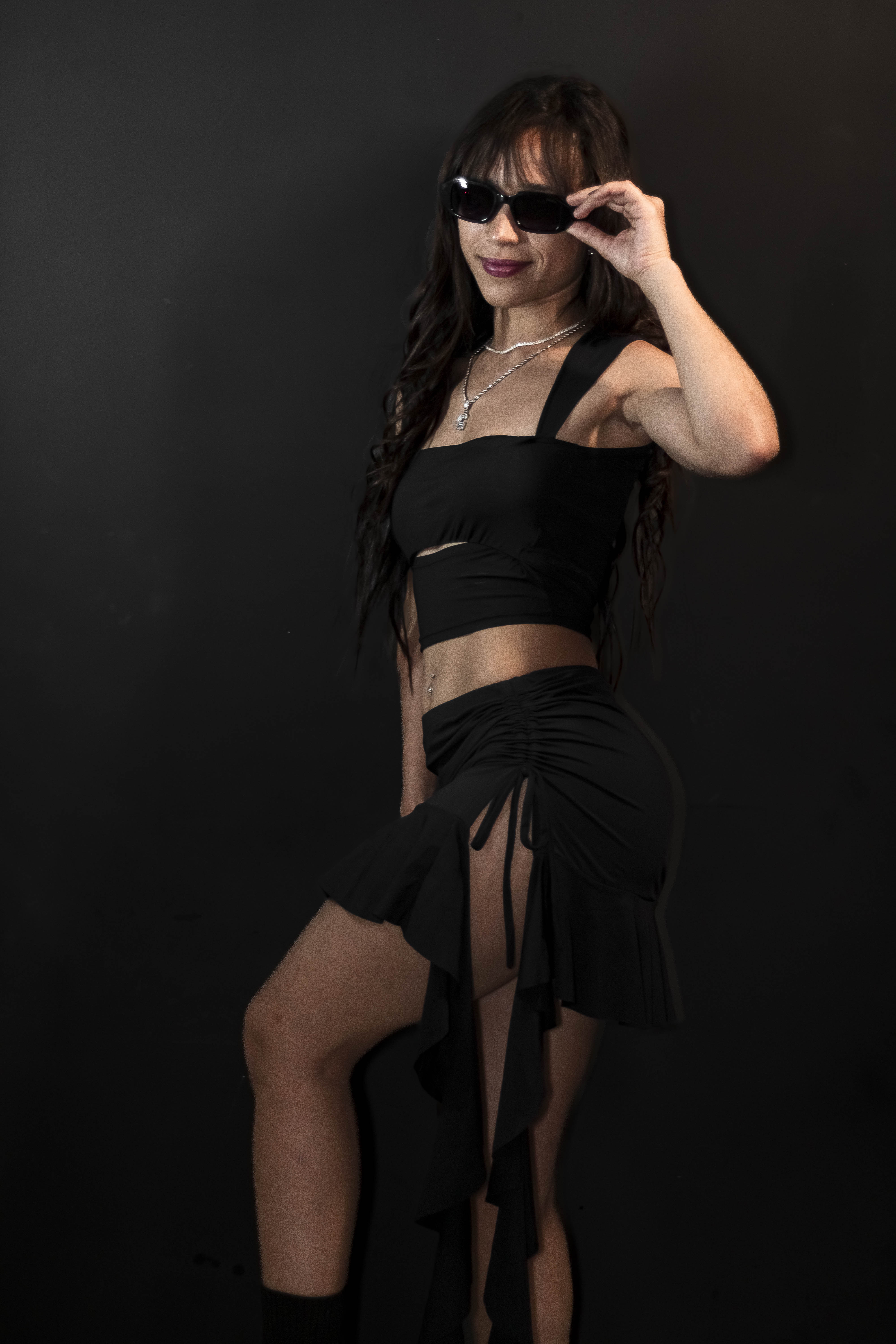 . Blusa com recorte na altura barriga e saia com detalhe de fenda na lateral